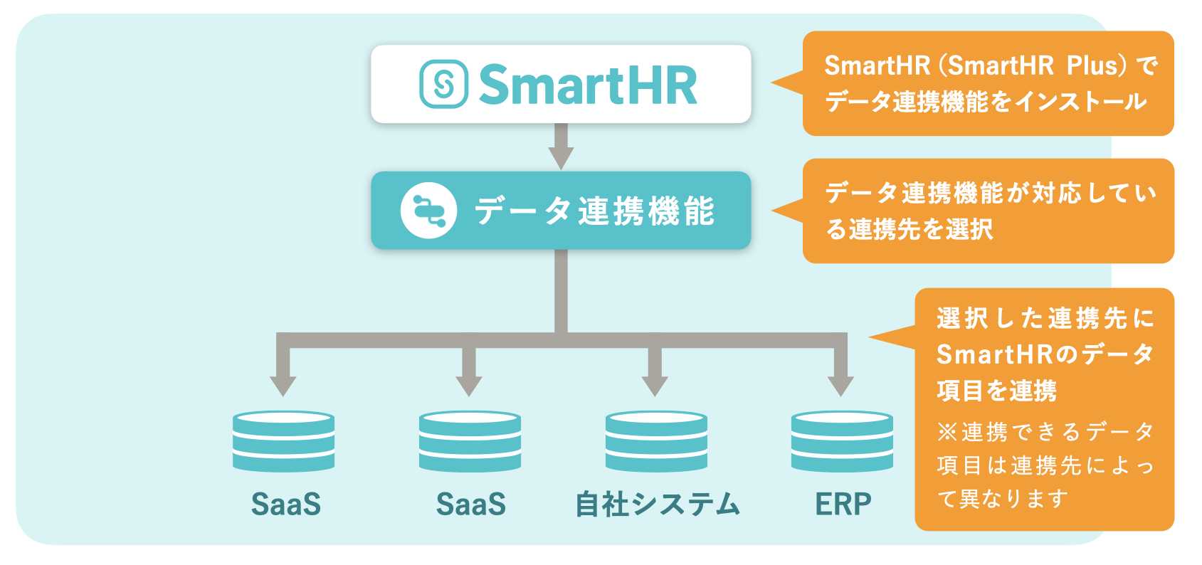 データ連携機能は、SmartHRの一貫したインターフェースによって、連携するアプリが増えた場合も、設定の手間や学習コストを極力増やさずに利用することができます。