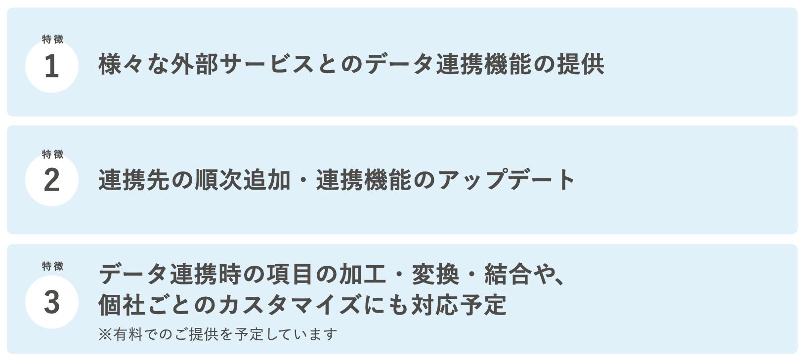 データ連携機能は、様々な外部サービスとの連携機能を提供し、順次連携先を拡充していきます。機能も随時アップデートしていく予定です。